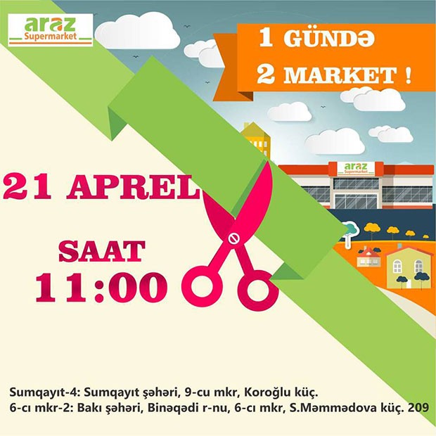21 aprel 2018-ci il tarixində Araz Supermarketlər şəbəkəsi Sumqayıt şəhəri 9-cu mkr-da və Bakı şəhəri, Binəqədi rayonunu 6-cı mkr ərazisində yerləşən filiallarını açacaqdır Bundan başqa, şəbəkə regionlarda da əhatə dairəsini genişləndirərək 24 apreldə Daşkəsən rayonunda, 25 aprel də Gəncə şəhərində və 26 apreldə Saatlı rayonunda yeni filiallarının açılışını edəcəkdir.
