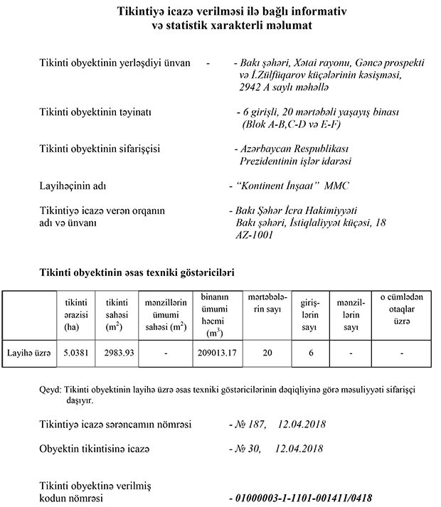Bakı şəhər İcra Hakimiyyəti aprelin 12-də Prezident Administrasiyası üçün daha bir yaşayış binasının tikintisinə icazə verib.