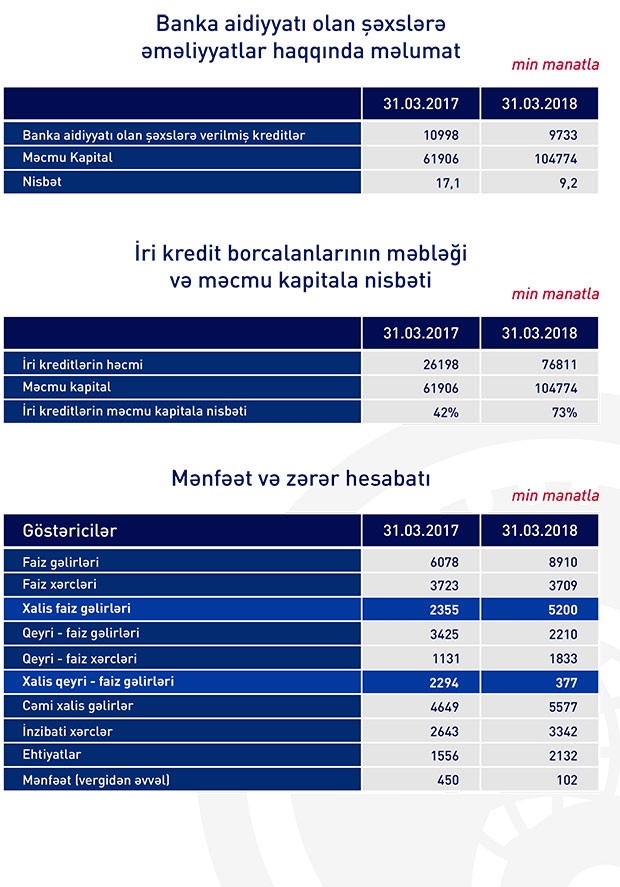 Müqayisə olunan dövrdə, Bankın rüblük faiz gəlirləri 6 milyon 78 min manatdan 8 milyon 910 min manata qalxıb (46,6% artım), qeyri-faiz gəlirləri isə 3 milyon 425 min manatdan 2 milyon 210 min manata düşüb (35,5% azalma).