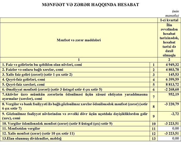 Cari ilin yanvar-mart dövründə "AG Bank"ın cəmi gəlirləri 11 milyon 348 min manat, xərcləri isə 13 milyon 616 min manat təşkil edib. Nəticədə Bankın 2 milyon 268 min manat əməliyyat zərəri yaranıb. Aktivlər üzrə mümkün zərərlərin ödənilməsi üçün xüsusi ehtiyatın yaradılmasına 952 min manat ayrıldığından "Ag Bank"ın zərəri 3 milyon 223 min manata qalxıb.