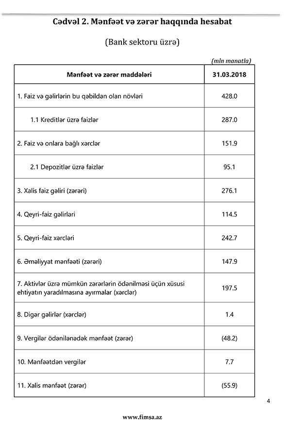 2018-ci ilin 1-ci rübünü 7 bank zərər ilə başa vurub. 7 bankın birlikdə zərəri 23 bankın mənfəətini üstələyib. Bu səbəbdən bank sektoru üzrə yekun nəticə mənfidir.