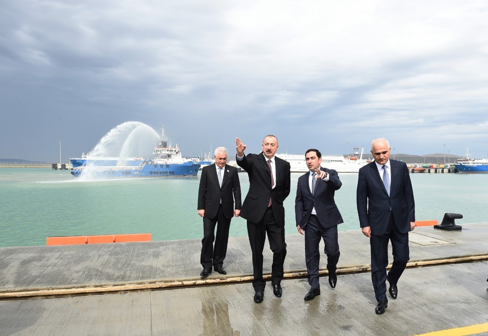 Dövlətimizin başçısı Bakı Beynəlxalq Dəniz Ticarət Limanı Kompleksinin açılışını bildirən düyməni basıb.