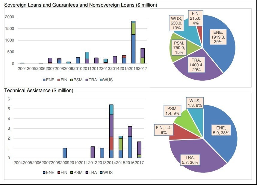 Ayrılmış kreditlərin 1 milyard 919 milyon 300 min dolları və yaxud 39%-i enerji sektoruna, 1 milyard 400 milyon 400 min dolları və yaxud 29%-i nəqliyyat, 750 milyon dolları və yaxud 14%-i dövlət sektorunun idarə edilməsinə, 630 milyon dolları və yaxud 13%-i su və şəhər infrastrukturu, həmçinin digər xidmət sektorlarına, 215 mlnmilyon dolları və yaxud 4%-i isə maliyyə sektoruna yönəldilib.