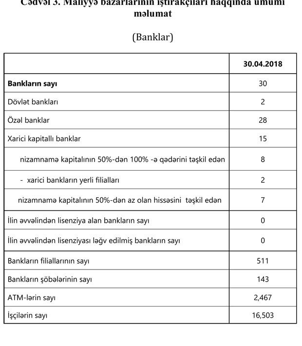 30 aprel 2018-ci il tarixinə bank sektorunun əsas göstəriciləri bank sektorunun icmal göstəricilərində öz əksini tapıb.