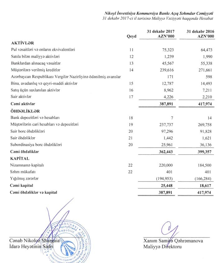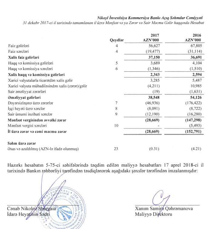 31 dekabr 2017-ci il tarixində tamamlanan il ərzində Bank 28 milyon 669 min manat məbləğində xalis zərərlə üzləşmişdir. Mənfi maliyyə nəticələrinə səbəb olan əsas amillər 2015, 2016 və 2017-ci illərdə kredit vermə əməliyyatlarının müvəqqəti azalması nəticəsində kredit portfelinin azalması ilə əlaqədar olaraq, kreditin dəyərsizləşməsi üzrə ehtiyatın artması və faiz gəlirlərinin azalması olmuşdur. Kredit vermənin anderraytinq meyarlarının sərtləşdirilməsi və borcalanların kredit qabiliyyətinin azalması kredit portfelinin azalmasına səbəb olmuşdur.