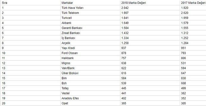 "Marja" xəbər verir ki, siyahıda ilk yeri 2 milyard 42 milyon dollarlıq marka dəyərilə Türk Hava Yolları (THY) tutur. Bu şirkətin ardınca 1 milyard 907 milyon dollarlıq marka dəyəri ilə "Türk Telekom" gəlir.