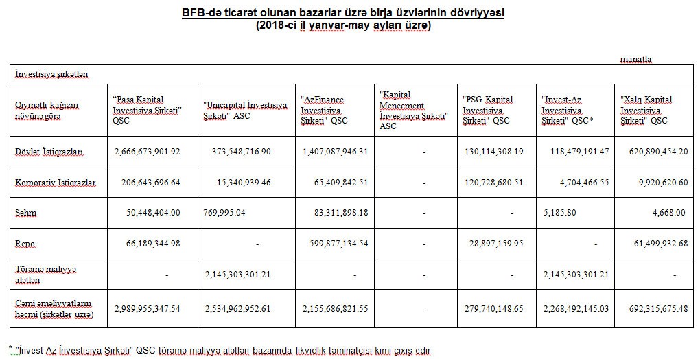 Birjadan “Marja”ya daxil olmuş məlumata görə, 2018-ci il yanvar-may ayları üzrə 2,9 milyard manatlıq dövriyə ilə “Paşa Kapital İnvestisiya Şirkəti 1-ci yerdədir.