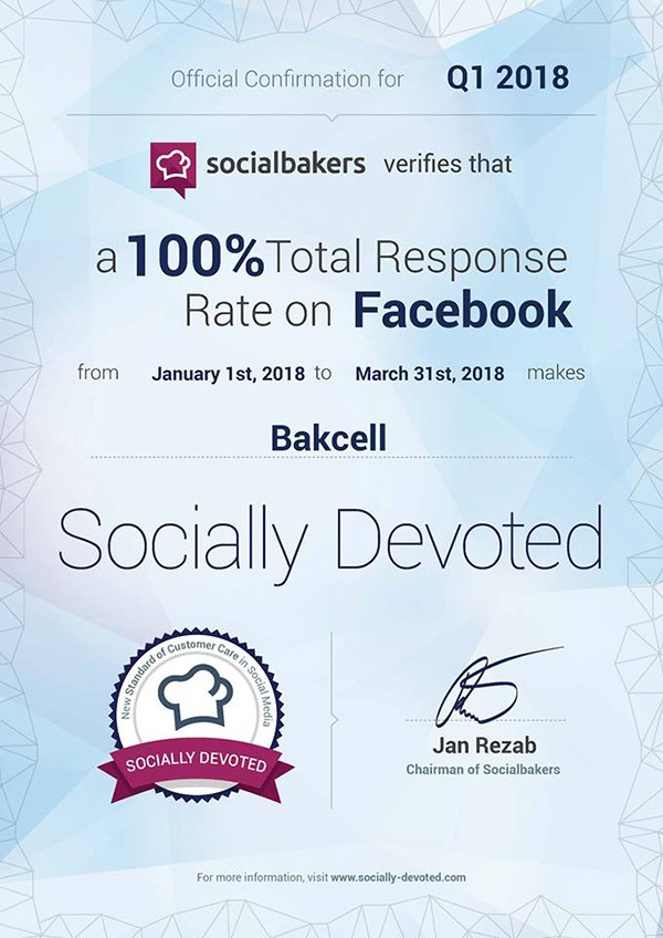 Xüsusi analitik platforma vasitəsilə dünya üzrə məşhur şirkətlərin sosial şəbəkələrdəki fəaliyyətinin monitorinqi ilə məşğul olan tanınmış “Socialbakers” şirkəti Azərbaycandakı şirkətlərin “Facebook” şəbəkəsində 2018-ci ilin I-ci rübü üzrə fəaliyyətlərini nəzərdən keçirib. Həmin monitorinqin nəticələrinə əsasən, Bakcell şirkəti 2018-ci ilin yanvar ayından mart ayına qədər olan müddət ərzində özünün rəsmi “Facebook” səhifəsinə daxil olmuş müraciətlərin 100%-ni cavablandırıb. Qeyd edək ki 2017-ci ildə “Bakcell” dörd dəfə abunəçi sorğularının cavablandırılması üzrə “Socially Devoted” sertifikatına layiq görülüb. “Bakcell”in “Facebook” səhifəsinin 400 mindən artıq istifadəçisinin olması bu nailiyyəti daha da vacib və təqdirəlayiq edir.