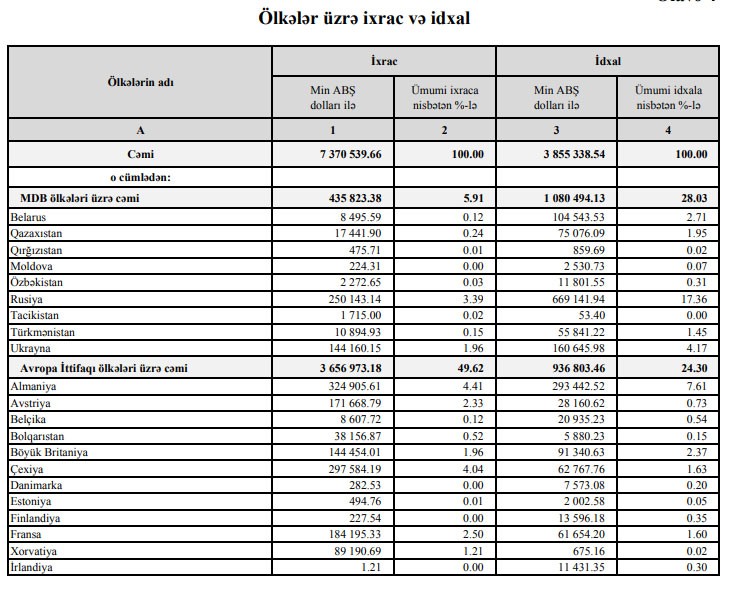 Hesabat dövründə Azərbaycanın bütün xarici ticarət dövriyyəsinin 8,19%-i Rusiya ilə ticarət əməliyyatlarının payına düşüb.