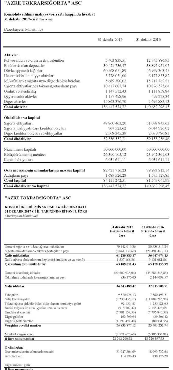 Azərbaycanın ilk təkrarsığorta şirkəti "AzRe Təkrarsığorta" ASC 2017-ci il üzrə konsolidə edilmiş maliyyə hesabatını açıqlayıb.