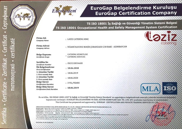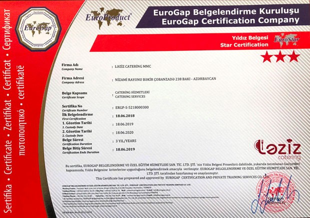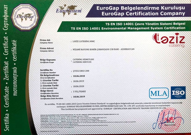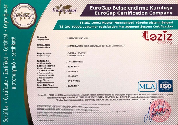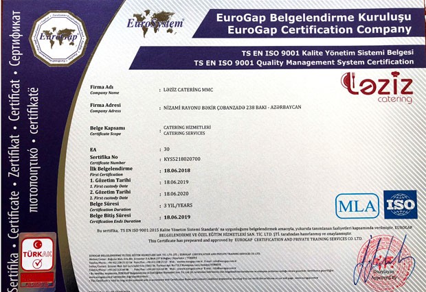 Şirkətdən verilən məlumata əsasən “EUROGAP” şirkəti tərəfindən Ləziz Cateringə TS EN ISO 22000:2005, İSO 9001:2015 və digər sertifikatlar yenilənərək təqdim edilmişdir. Şirkət tərəfindən daxili auditlər təşkil olunub, qida təhlükəsizliyi baxışları keçirilib, personalın təlimləri aparılıb və müddət bitimində Ləziz Catering bu sertifikatlarını yenilənməsinə layiq görülmüşdür. Bununla yanaşı digər TS EN ISO 22000:2005 Qida Təhlükəsizliyini İdarəetmə Sistemi, TS EN ISO 14001 – Ətraf mühitin idarəedilməsi sistemi, Star Certification və İSO 10002 Müştəri məmnuniyyəti sistemi sertifikatları da yenilənmişdir. Ləziz Cateringə verilən sertifikatları təmin edən şirkət olan “EUROGAP” bütün dünyada tanınan şirkətlərdəndir. EUROGAP Beynəlxalq MLA (Multilateral Agreement) çox tərəfli müqavilələrə görə Türkiyə ve bütün ölkələrdə sertifikasiya xidməti vermə hüququna malikdir.