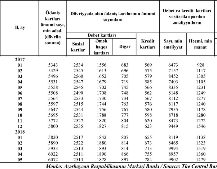 Qeyd edək ki, ötən ilin sonu ilə müqayisədə bu ilin 5 ayı ərzində kredit kartlarının sayı 161 min ədəd, sosial kart və əməkhaqqı kartı olmayan debet kartların sayı isə 82 min ədəd artıb.