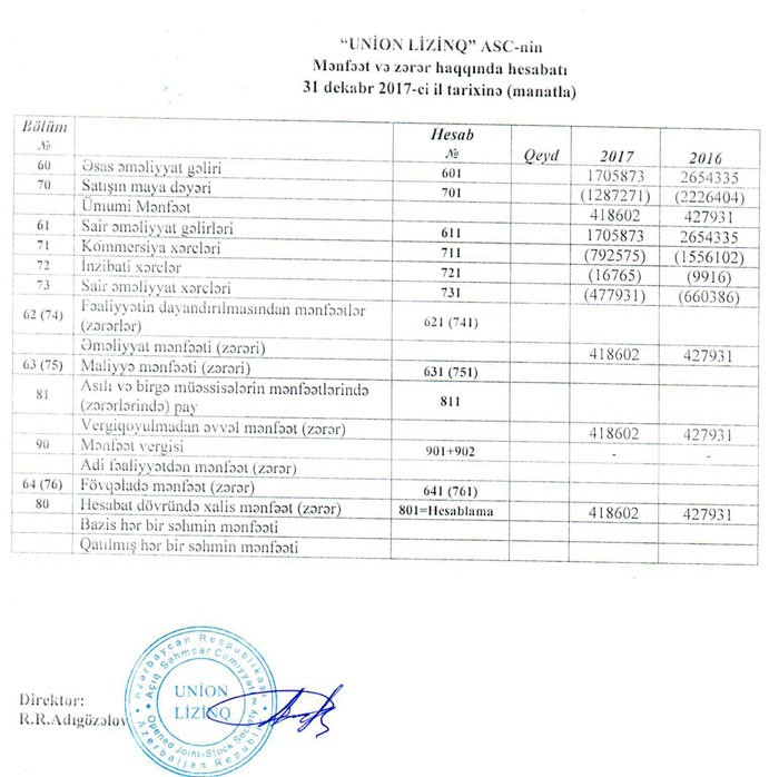“Union Lizinq” ASC 2017-ci ili 418 min 602 manat xalis mənfəətlə başa vurub. Şirkət 2016-cı ildə 427 min 931 manat xalis mənfəət əldə etmişdi.