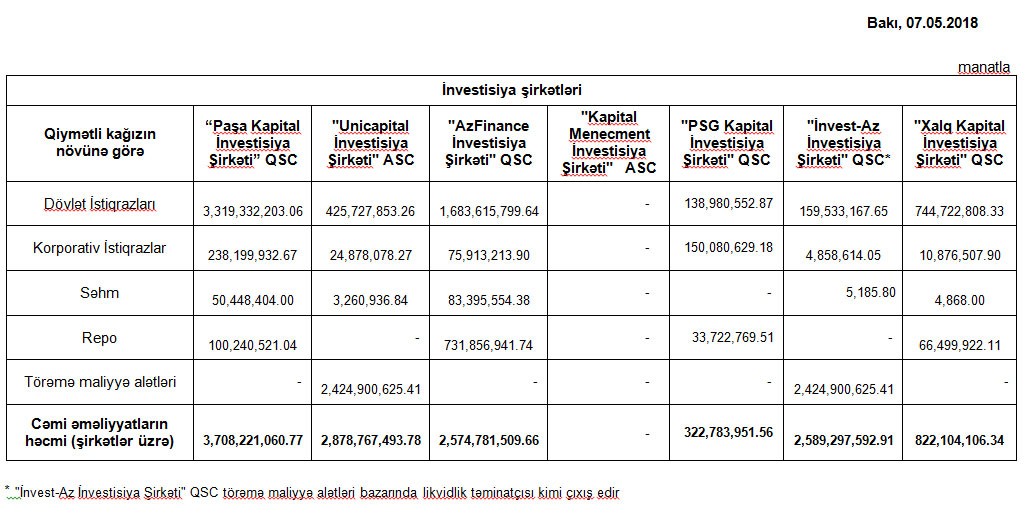 Birjadan “Marja”ya daxil olmuş məlumata görə, “Paşa Kapital İnvestisiya Şirkəti” QSC 3 milyard 708 milyon manatlıq dövriyyə ilə 1-ci, "Unicapital İnvestisiya Şirkəti" ASC 2 878 milyon manatlıq dövriyyə ilə 2-ci, "İnvest-Az İnvestisiya Şirkəti" QSC 2 milyard 589 milyon manatlıq dövriyyə ilə 3-cü yeri tutub.