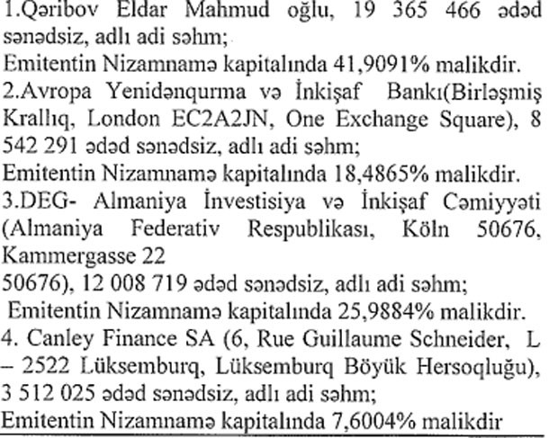 17 May 2018-ci il tarixində “Unicapital” İnvestisiya Şirkəti ASC tərəfindən rəsmiləşdirilməsi həyata keçirilmiş əqdə əsasən, Milli Depozit Mərkəzi bu səhmlərə mülkiyyət hüququnun ötürülməsini 3 İyul 2018-ci il tarixində qeydə alıb və bunun nəticəsində Avropa Yenidənqurma və İnkişaf Bankı, Bankın Nizamnamə Kapitalındakı payını 18,4865 %-dən 44,4748 %-ə qədər çatdırmaqla, 20 551 010 ədəd səhminin mülkiyyətçisinə çevrilib.