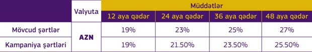 Kampaniyanın şərtlərinə uyğun olaraq, 12 aydan artıq müddətə istehlak krediti götürən kütləvi informasiya vasitələrinin nümayəndələrinə faizlərdə 1,5% endirim ediləcəkdir. Bundan əlavə, həmin şəxslərə bir illik xidmət müddətli MasterCard Gold debit kartı Bank tərəfindən hədiyyə ediləcəkdir.