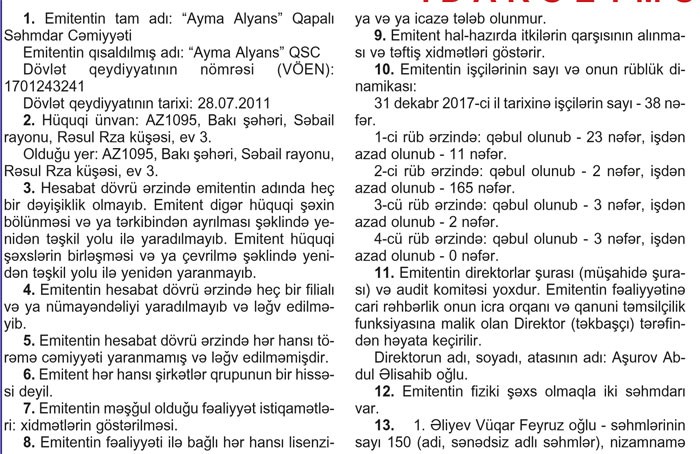 Bakıda butikləri və mağazaları idarə edən “Ayma Alyans” QSC (Əvvəlki Sinteks Group of Companies) 2017-ci ili 1 milyon 329 min manat xalis mənfəətlə başa vurub. Bu, 2016-cı illə müqayisədə 6 dəfə çoxdur. QSC 2016-cı ili 210 min manat xalis mənfəətlə bağlamışdı.