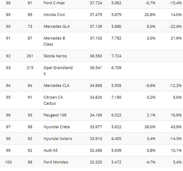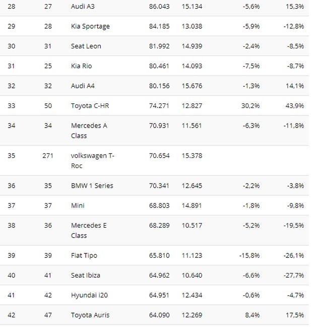 Sıralamanın ilk pilləsini artıq illərdir ki, Volkswagen Golf modeli qoruyub saxlayır. 6 ay ərzində 291 520 ədəd Volkswagen Golf satılıb.