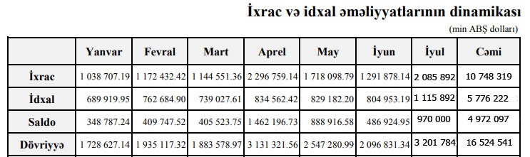 İyunda idxal 804 milyon 953 min dollar təşkil etmişdi. Bundan əvvəl 2018-ci ildə ən yüksək aylıq idxal Apreldə qeydə alınmışdı - 834 milyon 562 min dollar.