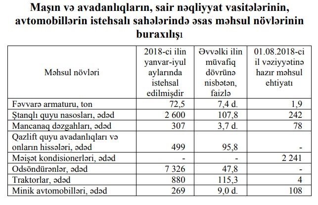 Xatırladaq ki, 2018-ci ilin yanvar-iyun ayları (6 ay) ərzində Azərbaycanda 130 ədəd minik avtomobili istehsal edilmişdi. Beləliklə, İyulda istehsal 139 ədəd artıb.