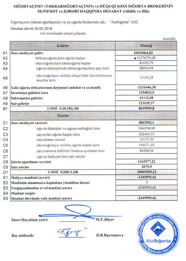 “AtaSığorta” ASC 2018-ci ilin birinci yarısını 2 milyon 350 min manat zərər ilə başa vurub.