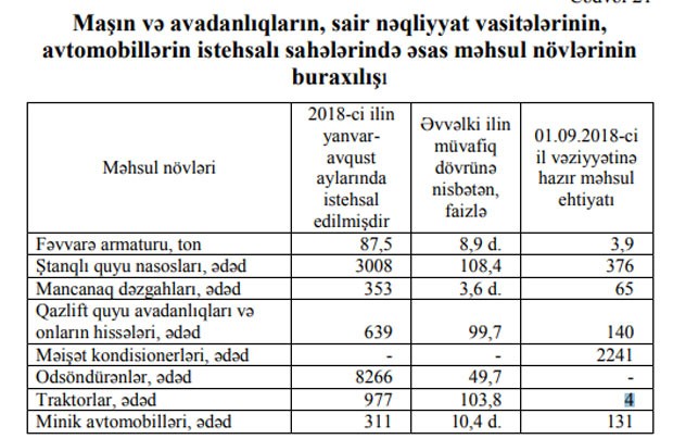 2018-ci ilin yanvar-avqust aylarında (8 ayda) Azərbaycanda cəmi 311 ədəd minik avtomobili istehsal edilib (daha doğrusu yığılıb).