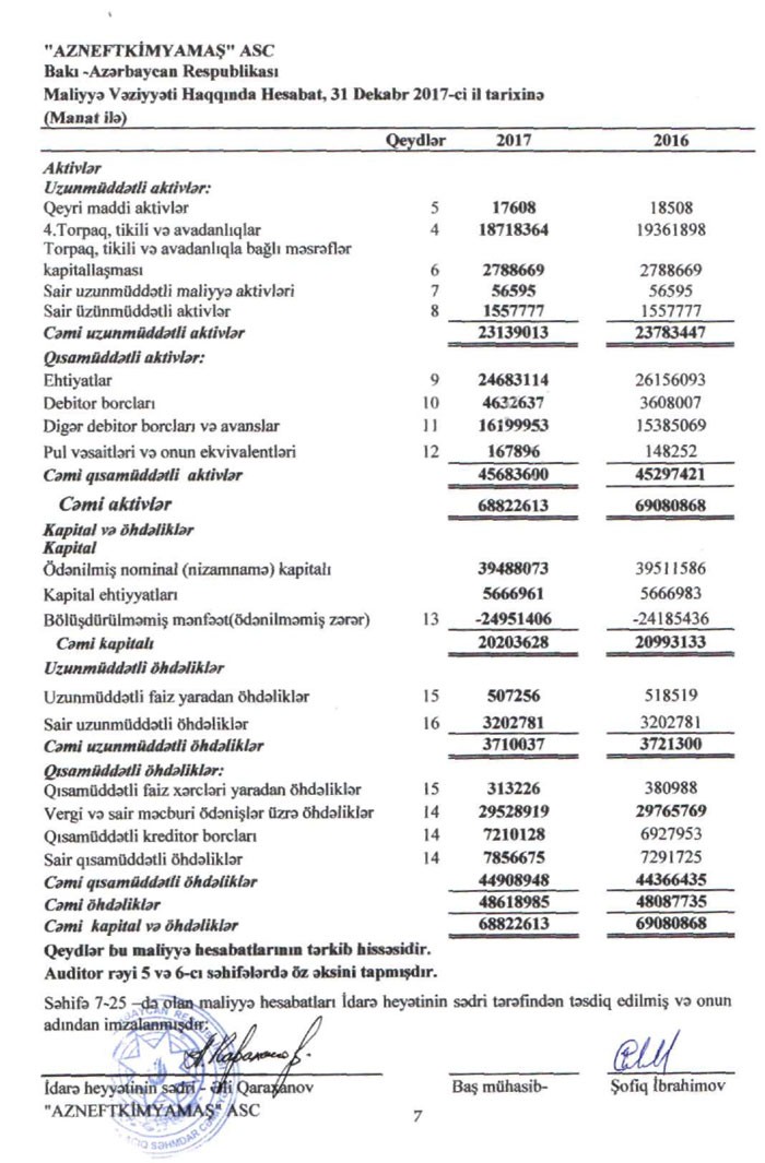 31 Dekabr 2017-ci il tarixində "Azneftkimyamaş" 68 milyon 822 min manat cəmi aktivlərə malik olub. Bu rəqəm 2016-cı ilin sonunda 69 milyon manatdan çox idi.