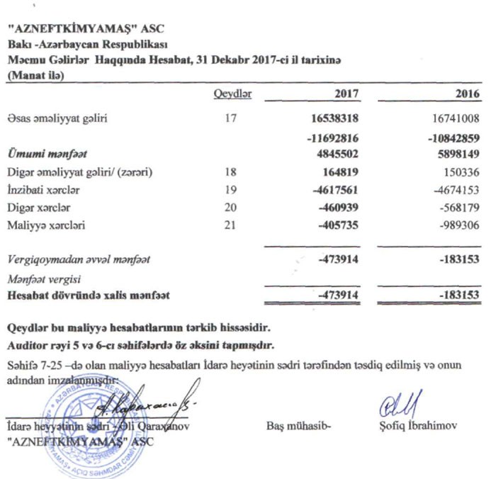 Xərclər artdığından "Azneftkimyamaş"ın ümumi mənfəəti azalıb. 2016-cı ildə ümumi mənfəət 5 milyon 898 min manat ikən, 2017-ci ildə 4 milyon 845 min manat təşkil edib.