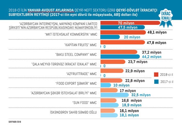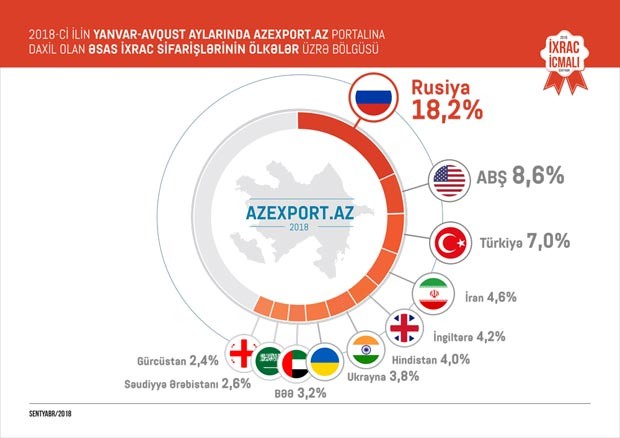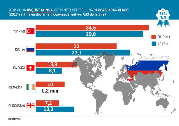 Cari ilin yanvar-avqust ayları ərzində Rusiyaya 375 milyon, Türkiyəyə 249,8 milyon, İsveçrəyə 92 milyon, Gürcüstana 88,5 milyon və Çinə 32 milyon ABŞ dolları dəyərində qeyri-neft sektoruna aid mal ixrac olunub.