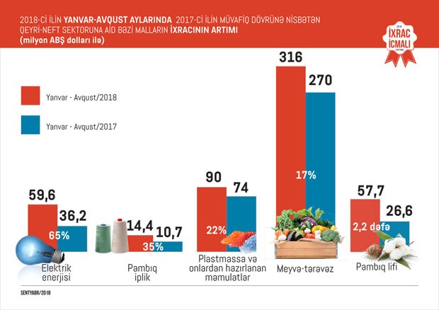 Ümumiyyətlə 2018-ci ilin yanvar-avqust ayları ərzində meyvə-tərəvəz ixracı 316 milyon, plastmassa və onlardan hazırlanan məmulatların ixracı 90 milyon, alüminium və ondan hazırlanan məmulatların ixracı 91 milyon, elektrik enerjisinin ixracı 60 milyon, qara metallar və onlardan hazırlanan məmulatların ixracı 57 milyon, pambıq lifi ixracı 58 milyon, kimya sənayesi məhsullarının ixracı 41 milyon, pambıq ipliyi ixracı 14 milyon ABŞ dolları təşkil edib. 2017-ci ilin müvafiq dövrü ilə müqayisədə 2018-ci ilin 8 ayında elektrik enerjisinin ixracı 64 faiz, pambıq ipliyinin ixracı 35 faiz, plastmassa və onlardan hazırlanan məmulatların ixracı 22 faiz, meyvə-tərəvəzin ixracı 17 faiz, alüminium və ondan hazırlanan məmulatların ixracı 14 faiz, qara metallar və onlardan hazırlanan məmulatların ixracı 1 faiz artıb.