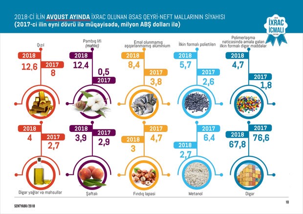2018-ci ilin avqust ayında qeyri-neft sektoru üzrə ixracda qızıl (12,6 milyon ABŞ dolları) birinci, pambıq lifi (12,4 milyon ABŞ dolları) ikinci, emal olunmamış aşqarlanmamış alüminium (8,4 milyon ABŞ dolları) isə üçüncü olub.