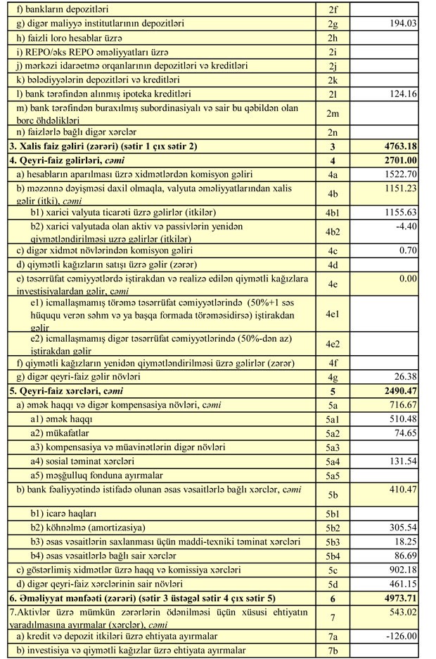 Belə ki, cari ilin yanvar-sentyabr dövründə Bankın faiz gəlirləri 5 milyon 81 min manat, qeyri-faiz gəlirləri 2 milyon 701 min manat təşkil edib (Cəmi gəlirlər 7 milyon 782 min manat).