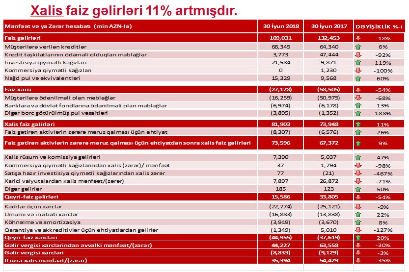 Bankın xalis mənfəəti 30 iyun 2018-ci il tarixinə bitən 6 ay üzrə 35 milyon 394 min AZN olmuşdur. Bu məbləğ keçən ilin ilk 6 ayında 50 milyon 324 min manat təşkil etmişdi. 30 İyun 2018-ci il tarixinə faiz gəlirləri 109 milyon 31 min AZN səviyyəsinə çatmışdır. 30 İyun 2017-ci il tarixinə bu məbləğ 132 milyon 453 min AZN olmuşdu.