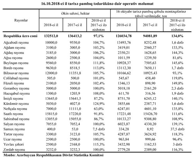 AZƏRTAC respublikada pambıq tədarükünə dair oktyabrın 16-na olan operativ məlumatı təqdim edir.