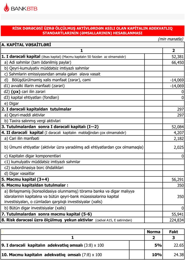 Müqayisə üçün qeyd edək ki, ötən ilin yanvar-sentyabr ayları ərzində “Bank BTB” nin cəmi gəlirlər 11 milyon 73 min manat (faiz gəlirləri 10 milyon 157 min manat, qeyri-faiz gəlirləri 916 min manat) xərcləri isə 15 milyon 806 min manat təşkil etmişdi. Nəticədə Bank, ötən ilin 9 ayını 4 milyon 733 min manat əməliyyat zərəri ilə başa vurmuşdu. Aktivlər üzrə mümkün zərərlərin ödənilməsi üçün xüsusi ehtiyatın 4 milyon 895 min manatı azad olduğundan əməliyyat zərəri bağlanmış və “Bank BTB” 162 min manat xalis mənfəət əldə etmişdi.