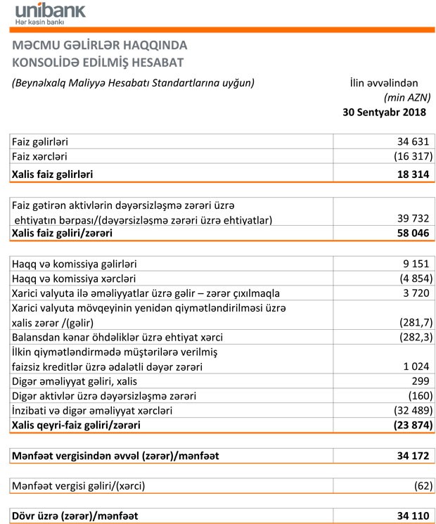 2018-ci ilin 9 ayında “Unibank”ın cəmi gəlirləri 48 milyon 825 min manat, cəmi xərcləri (faiz, qeyri-faiz, inzibati və s.) isə 54 milyon 384 min manat təşkil edib. Nəticədə 5 milyon 559 min manat əməliyyat zərəri yaranıb. Lakin, ehtimal olunun kredit və depozit itkiləri üçün əvvəlki illərdə yaradılmış ehtiyatın 39 milyon 732 min manatı azad olduğundan gəlirə əlavə edilib. Nəticədə, həm əməlyyat zərəri bağlanıb, həm də “Unibank” xalis mənfəət əldə edib. Ehtiyatların azad olması Bankın ödənməyən kreditlər böhranını geridə qoyduğuna işarədir.