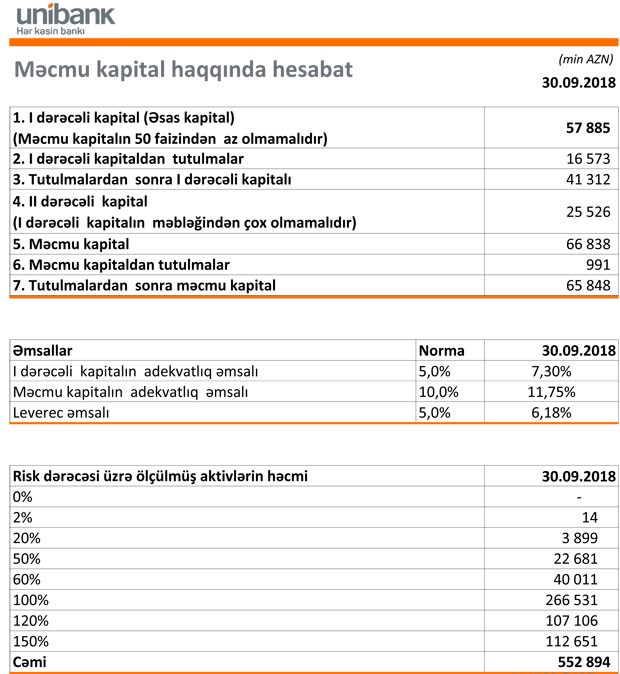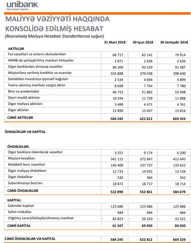 30 Sentyabr 2018-ci il tarixində “Unibank” 669 milyon 329 min manat cəmi aktivlərə, 584 milyon 679 min manat cəmi öhdəliklərə və 84 milyon 650 min manat cəmi balans kapitala malik olub.