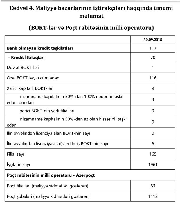 2018-ci ilin sentyabr ayı ərzində bank sektorunun aktivləri 3.8% (1 milyard 74.7 milyon manat), öhdəlikləri 4.2% (1 milyard 11.5 milyon manat), balans kapitalı isə 1.6% (63.2 milyon manat) artıb.