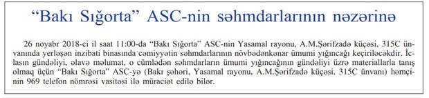 26 noyabr 2018-ci il tarixində "Bakı Sığorta" ASC səhmdarlarının növbədənkənar ümumi yığıncağı keçiriləcəkdir.