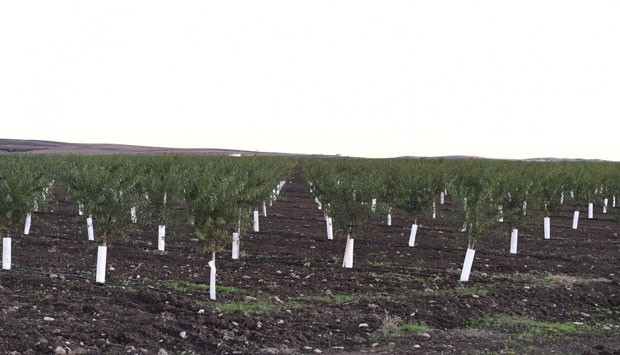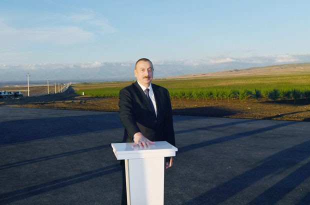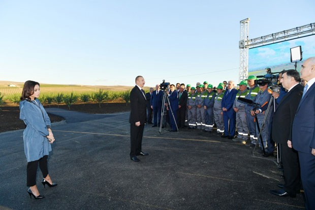 Sonra Prezident İlham Əliyev aqroparkın suvarma sisteminin işə salınmasını bildirən düyməni basdı və əkin sahəsinə baxıb.