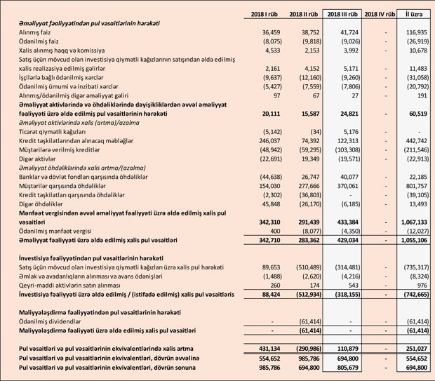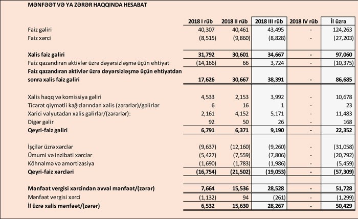 2017-ci ilin yanvar-sentyabr dövründə Bankın cəmi gəlirləri 161 milyon 91 min manat, o cümlədən faiz gəlirləri 122 milyon 559 min manat, qeyri-faiz gəlirləri 38 milyon 532 min manat təşkil etmişdi. Qeyri-faiz gəlirlərinin azalması xarici valyuta ilə əməliyyatlardan gəlirlərin 27 milyon 978 min manatdan 11 milyon 483 min manata düşməsidir. Manatın məzənnəsi sabitləşdiyindən spredlər də azalıb və bu azalma bankların gəlirlərinə mənfi təsitr göstərib.