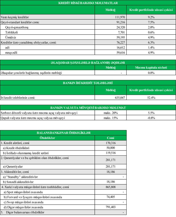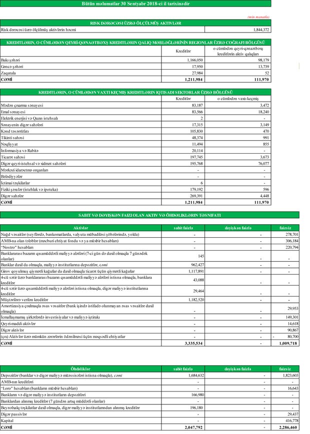 Müştərilərə verilən kreditlər ötən ilin Sentyabr ayının sonundakı 903 milyon 571 milyon manatdan 30 Sentyabr 2018-ci il tarixində 1 milyard 144 milyon 269 milyon manata yüksəlib. Bankın kredit portfeli təxminən 27% artıb.Müştərilərə verilmiş kreditlərin 111 milyon 970 min manatının və ya 9,2%-nin ödəmə vaxtı keçib.