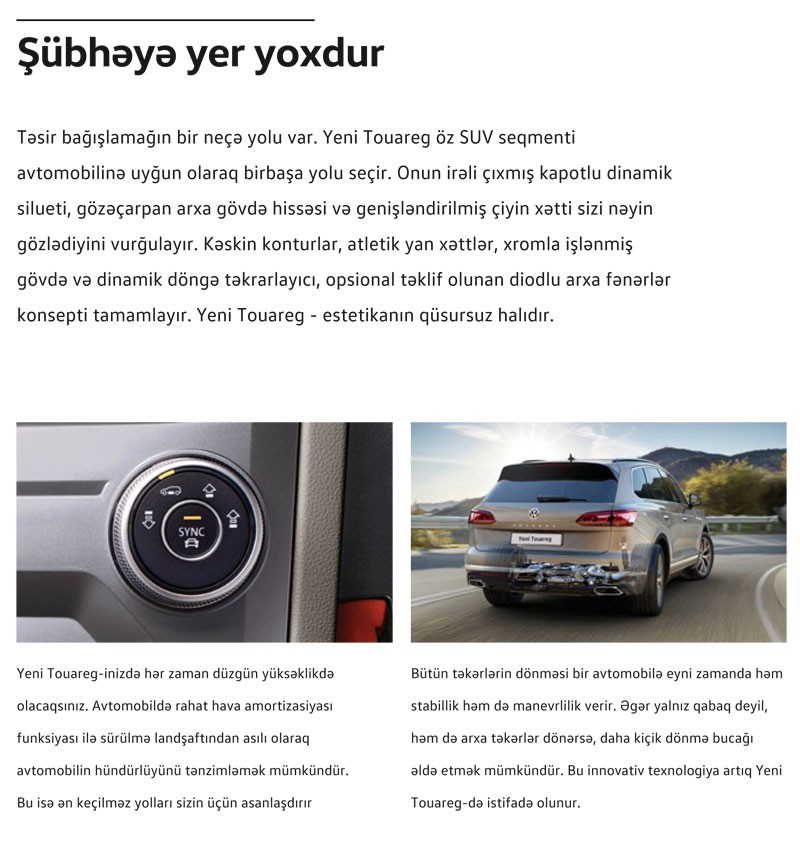 Yeni Touareg modelləri artıq noyabr ayında Azərbaycanda olacaq, ancaq ona sahib olmaq üçün gözləməyə ehtiyac yoxdur. Siz artıq bu gündən Volkswagen Bakı Mərkəzinə yaxınlaşaraq öz sifarişlərinizi edə bilərsiniz.