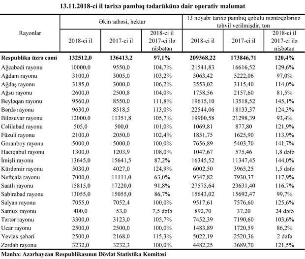 Noyabrın 13-dək ölkə üzrə pambıq qəbulu məntəqələrinə 209 min 368 ton məhsul təhvil verilib.