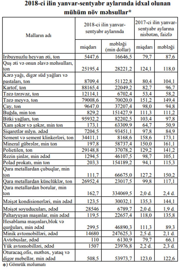 2018-ci ilin yanvar-sentyabr aylarında Azərbaycana idxal olunan mühüm növ məhsullar açıqlanıb.