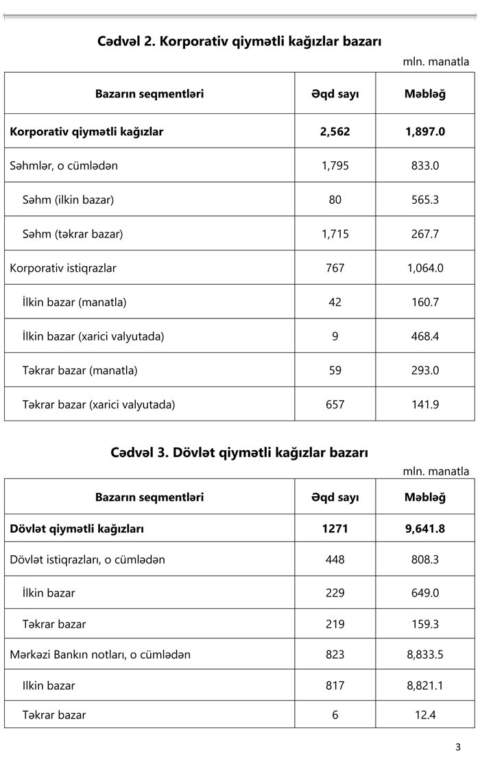 2018-ci ilin 9 ayı ərzində qiymətli kağızlar bazarında ümumilikdə 18 mlrd. 657.7 mln. manat həcmində əməliyyat aparılıb ki, bu da ötən ilin müvafiq dövrü ilə müqayisədə 2 dəfə çoxdur. Artımın əsas səbəbi Mərkəzi Bankın notları və Maliyyə Nazirliyinin istiqrazlarıdır.
