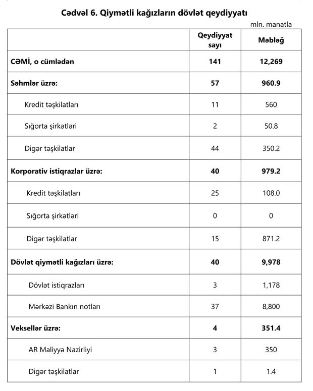 Hesabat dövründə ümumilikdə 12 mlrd. 269 mln. manat həcmində (141 sayda qeydiyyat) qiymətli kağızların dövlət qeydiyyatı aparılıb.