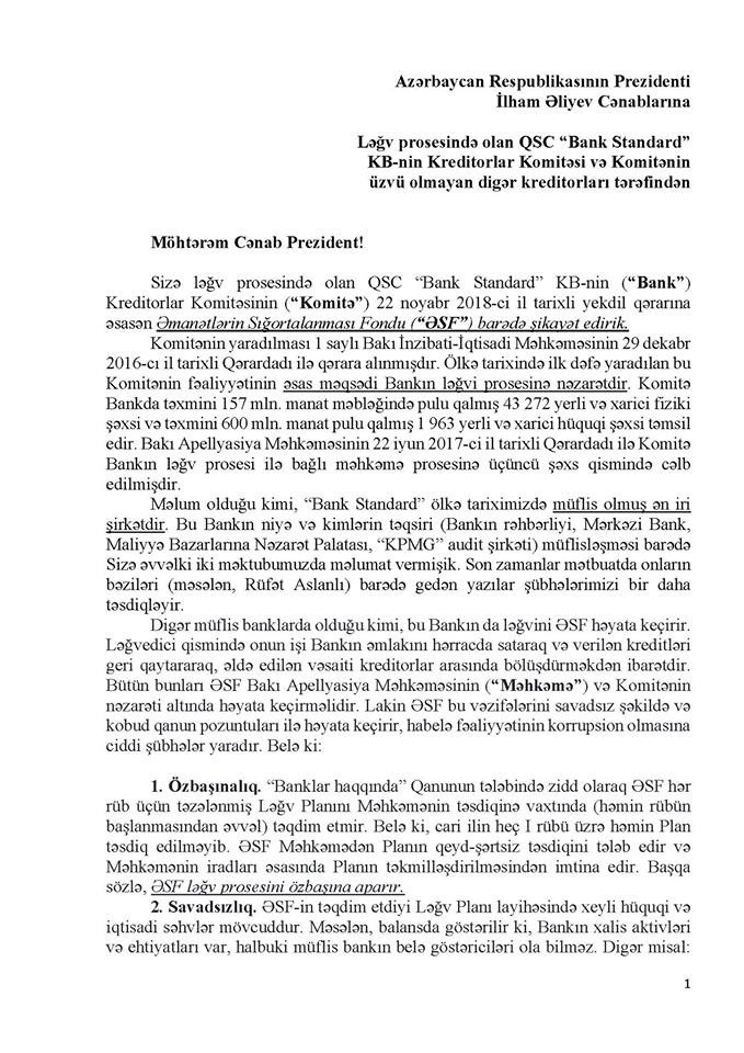 "Bank Standard"la bağlı prezidentə müraciət - TAM MƏTN