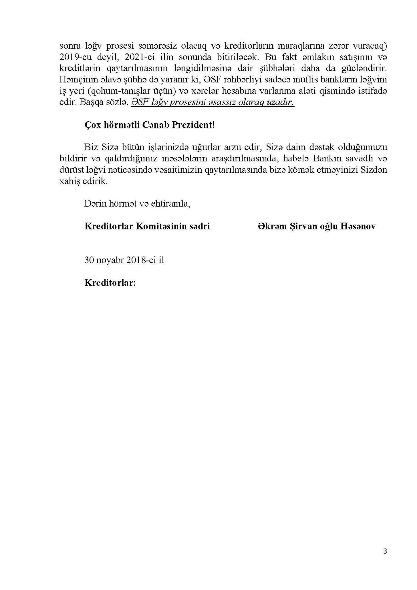 Əmanətçilərin dövlət başçısına müraciətinin tam mətnini təqdim edirik.