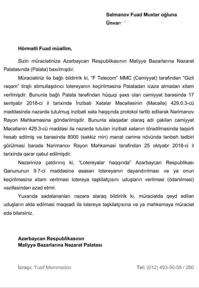 Məlumata görə, “F Telekom” tənzimləyici qurumdan icazə almadan mobil operatorlar ilə birlkdə “Gizli rəqəm” adlı stimullaşdırıcı lotereya keçirib. MBNP-nin məsələyə müdaxiləsindən sonra lotereya dayandırılıb və Nərimanov Rayon Məhkəməsinin 25 oktyabr 2018-ci il tarixli qərarı ilə “F Telekom” İnzibati Xətalar Məcəlləsinin 429.3-cü maddəsi ilə təqsirli bilinib və 8 min manat cərimə edilib.